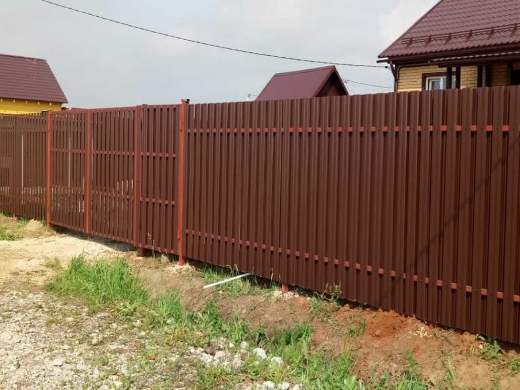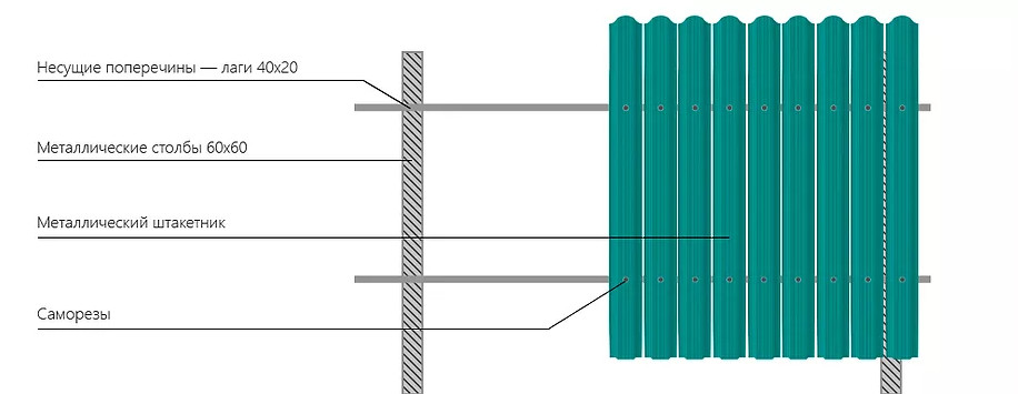 Основой металлического забора могут служить разные материалы. Для бюджетных ограждений используются опорные столбы из металлического профиля квадратного или прямоугольного сечения. Они устанавливаются на определенном расстоянии друг от друга, к ним крепятся горизонтальные металлические лаги и к ним прикручиваются готовые штакетины.